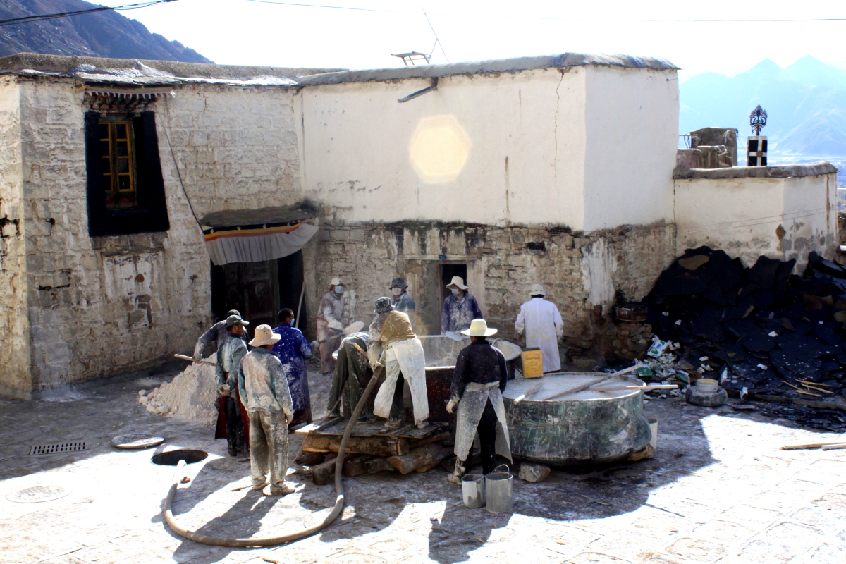 - Mixing the whitewash to paint the buildings white – a very messy process.