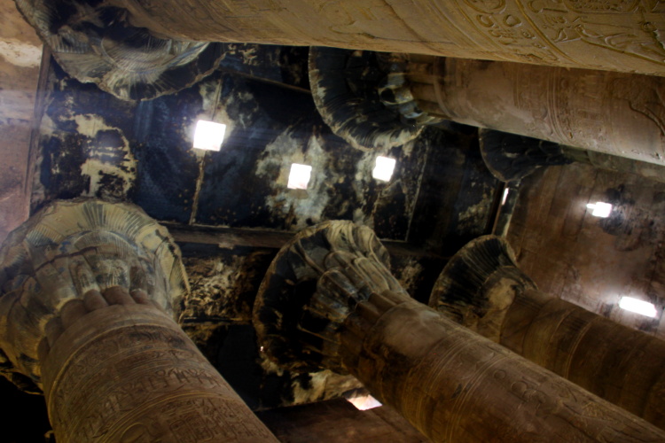 The ceiling of the hypostyle hall still black with soot from when the temple was used as a church. Restoration and cleaning is still going on.