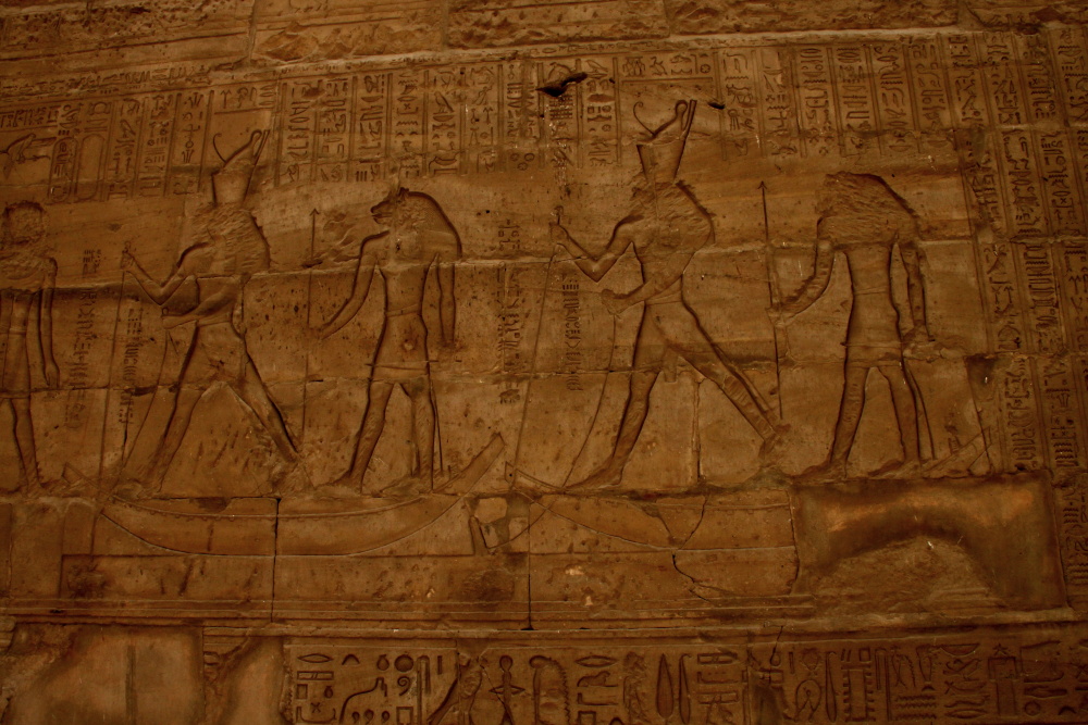 A panel of the sequence from the surrounding wall, showing the fight between Horus and Seth; unfortunately, Seth is lost or chipped away here. Horus hunts him from a boat, and Seth was depicted as a hippopotamus or similar beasts. Note that like many sites, the images of the gods, especially faces, have been chipped at by early Christians.
