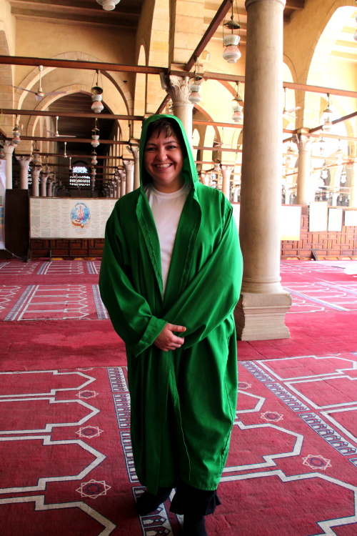 Amr Ibn Aas mosque – Kellie in appropriate covering for women. (Green for Islam) They loan these at the door to ensure decorum is observed inside.