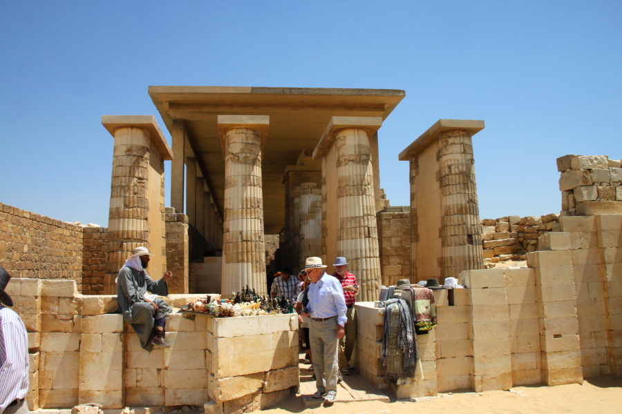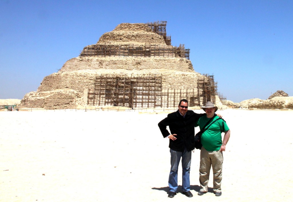Me with our guide (and fantastic tour organizer) Ahmed Hamed Yousif in front of the Step Pyramid. Notice that Egyptians don’t seem to feel the heat like Canadians – he’s wearing a black courdroy blazer and blue jeans and looks cool, I’m wearing thin clothes and still sweating like crazy…