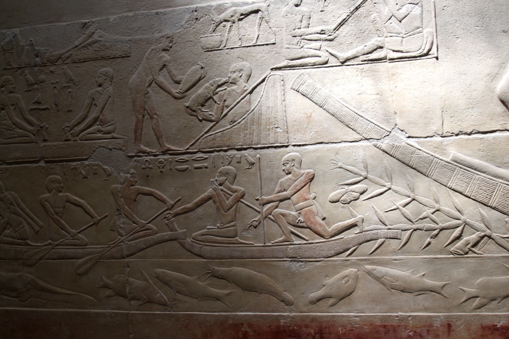 Fishing below domestic scenes; note the variety of fish shown; the women making bread above left; and it looks like a one-armed woman kissing a pig (?!).