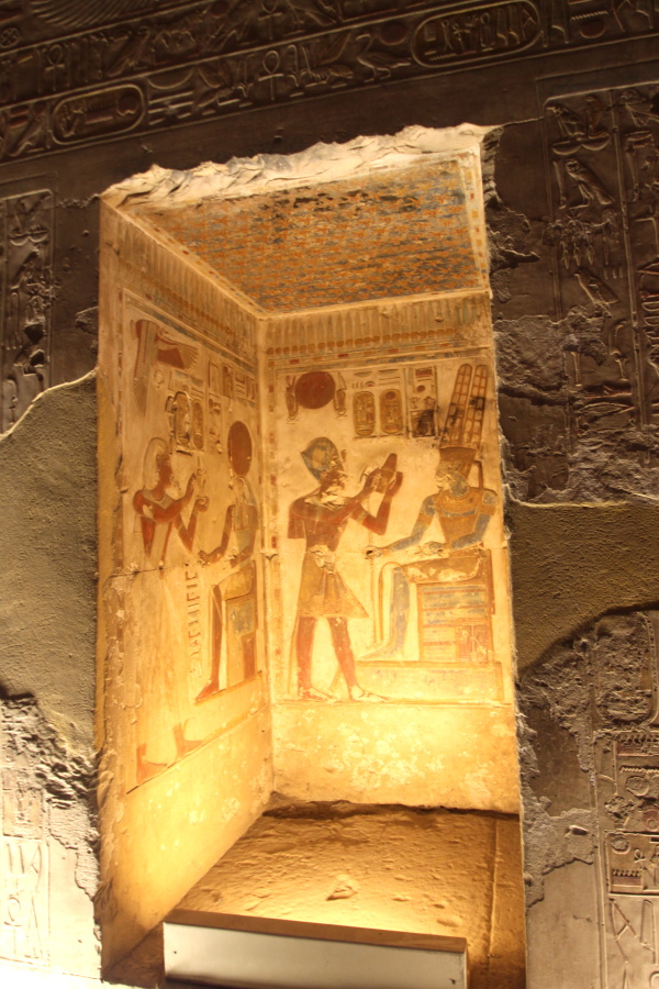The wall carvings are deteriorating and difficult to make out – but this side corridor contains one of the few “King Lists” showing all the paroahs of Egypt up to Sethos I. (The embarrassing unmentionable ones like Ankhaten and his family were left out. ) Royal names – birth or ruling names – are enclosed in oval cartouches.