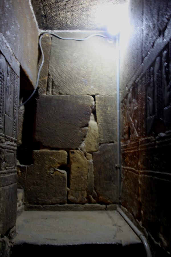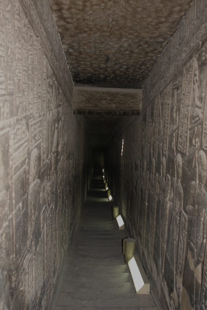 Stairway down from roof of temple. In Dendara Temple tourists are allowed to go up to the roof. The ascent is a winding (spiral) satirs that mimics the spiral ascent of the vultures often carved on ceilings; the stairway down is a long straight incline mimicking the vulture’s straight downward glide.