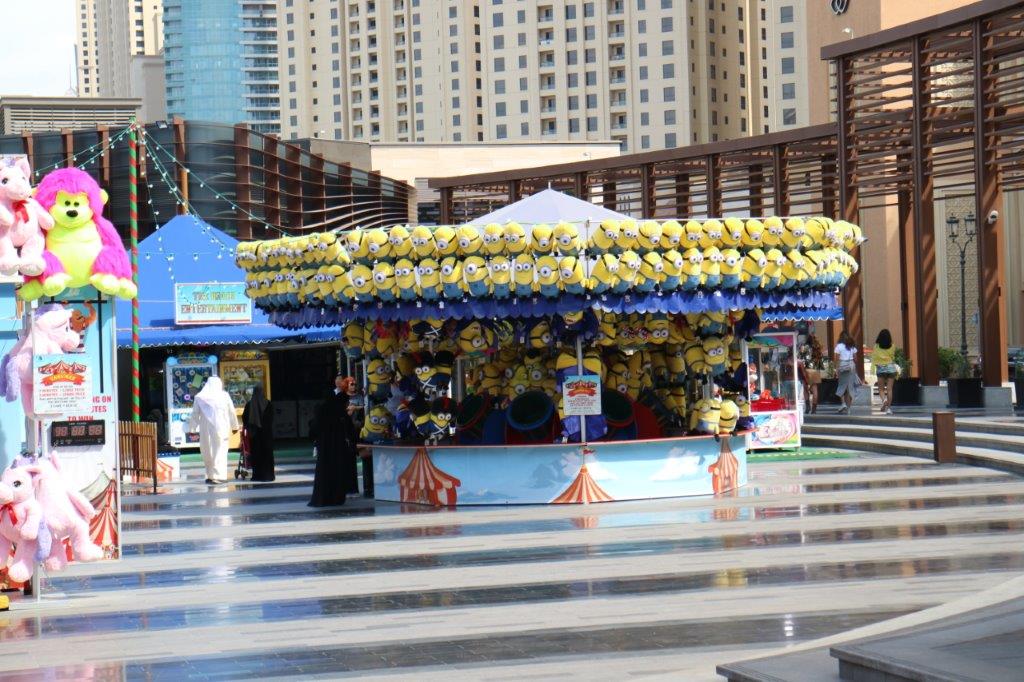 Win a Minion! A carnival game kiosk in a small square near the beach.