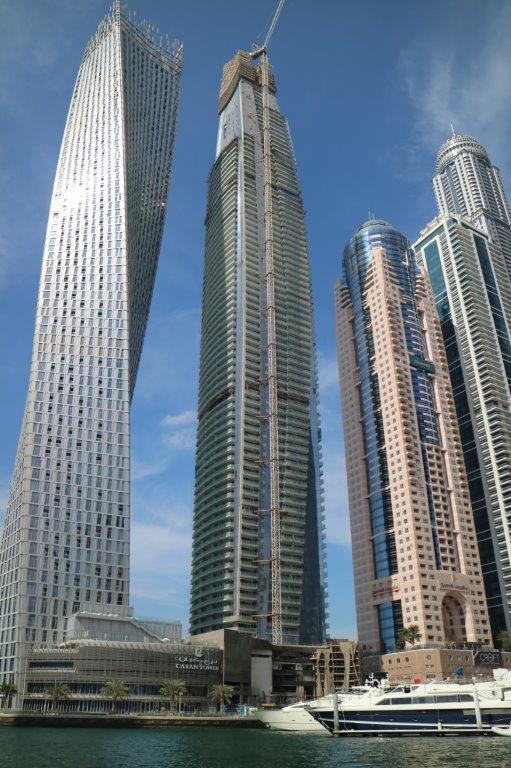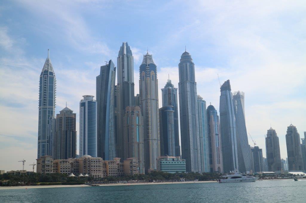The fabulous skyline of skyscrapers surrounding the marina near the Palm. This is just one of several concentrations of tall buildings in Dubai.