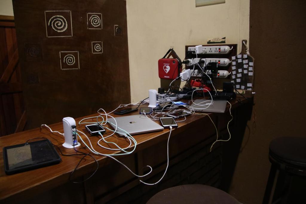 The modern age meets “roughing it”. there is no electricity in the tents, so you must charge anything you need at the bar. A sign of the times that the devices were overwhelmingly cellphones and computers, not camera batteries.